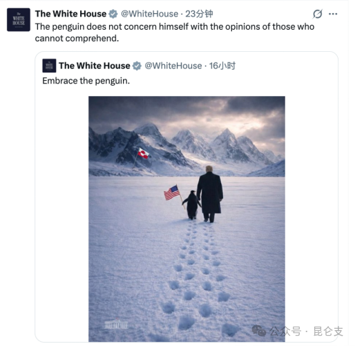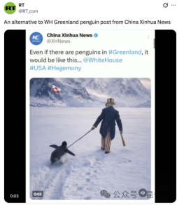 今日俄罗斯一天之内转发三次,还发表题为《中国借格陵兰企鹅梗图调侃白宫》的报道。