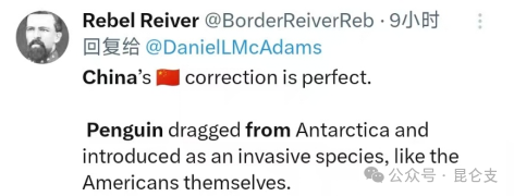 不少外国媒体人纷纷转发。一位叫Rebel Reiver的网友说:“中国(媒体)的这版二创真是完美。企鹅一路被强行从南极洲拖到格陵兰,成为当地入侵物种,反映的正是美国自身。”